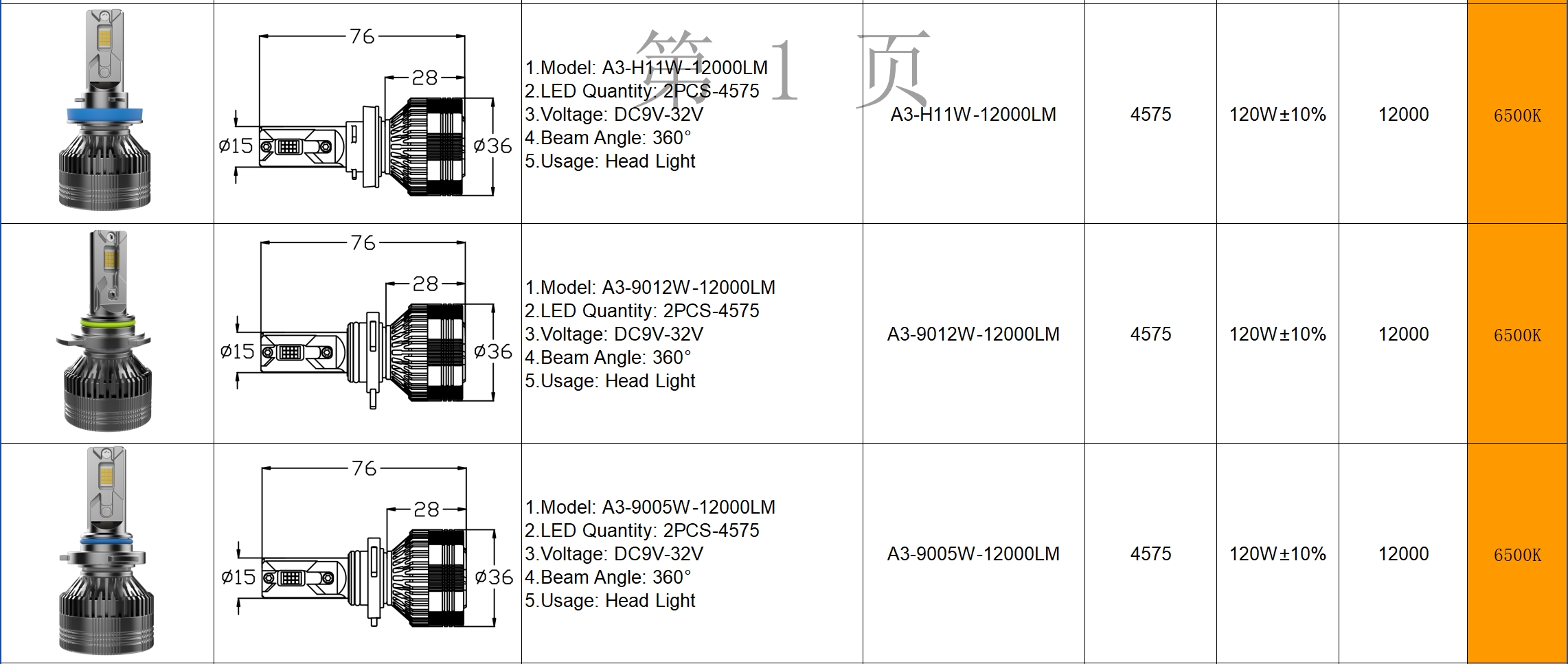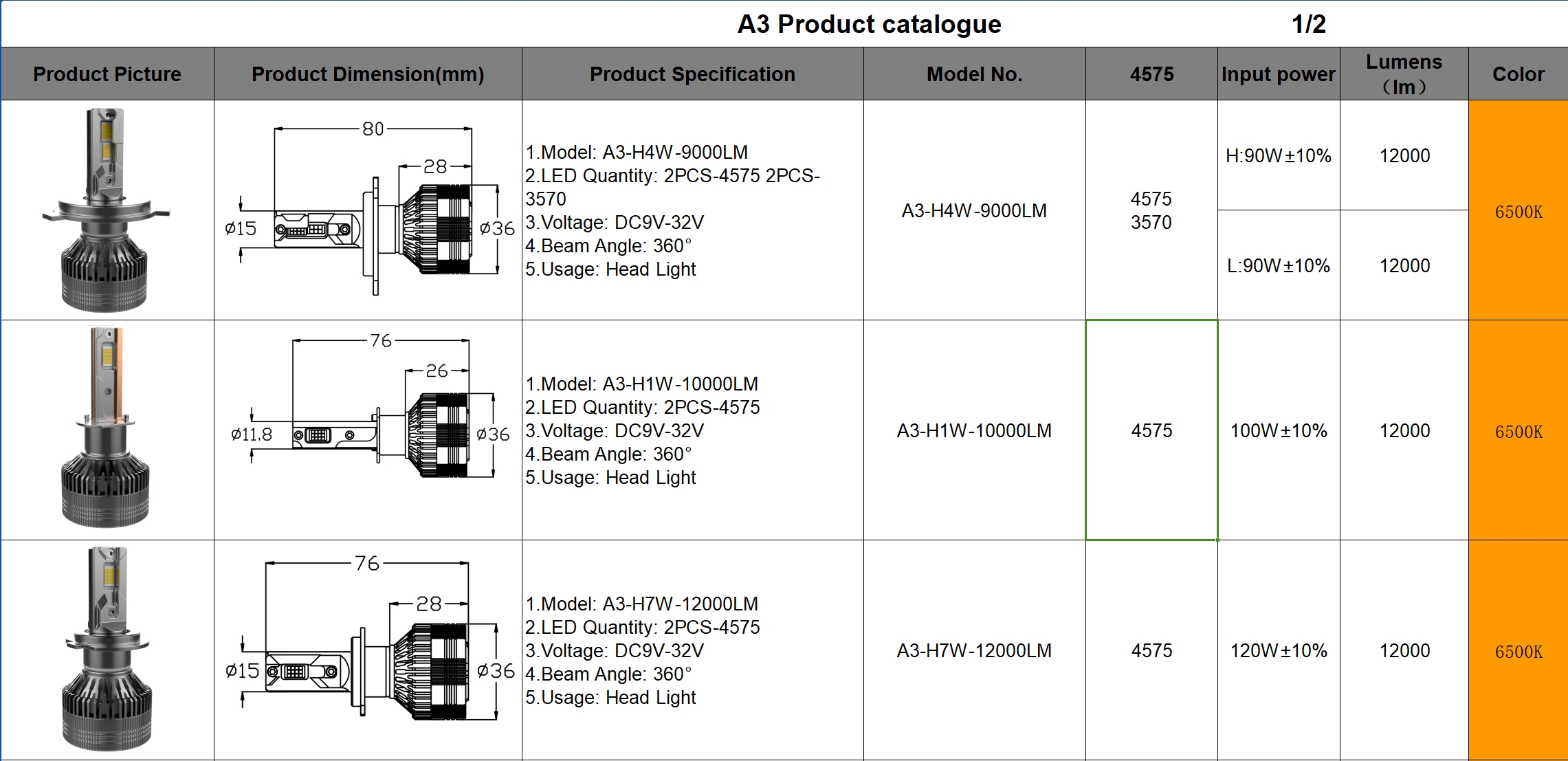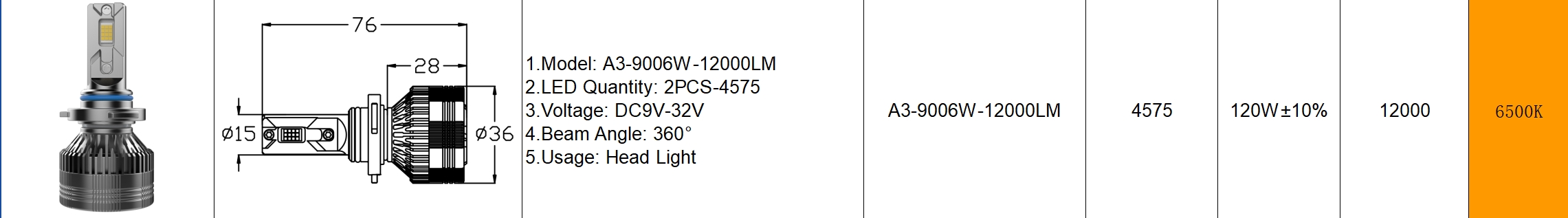 ziongreen A3 H4 75W 7500LM H7120W 12000LM DC9V-32V 3570 H4 H7 H11 9005 9006 Head Light External Stepped Drive Price:¥